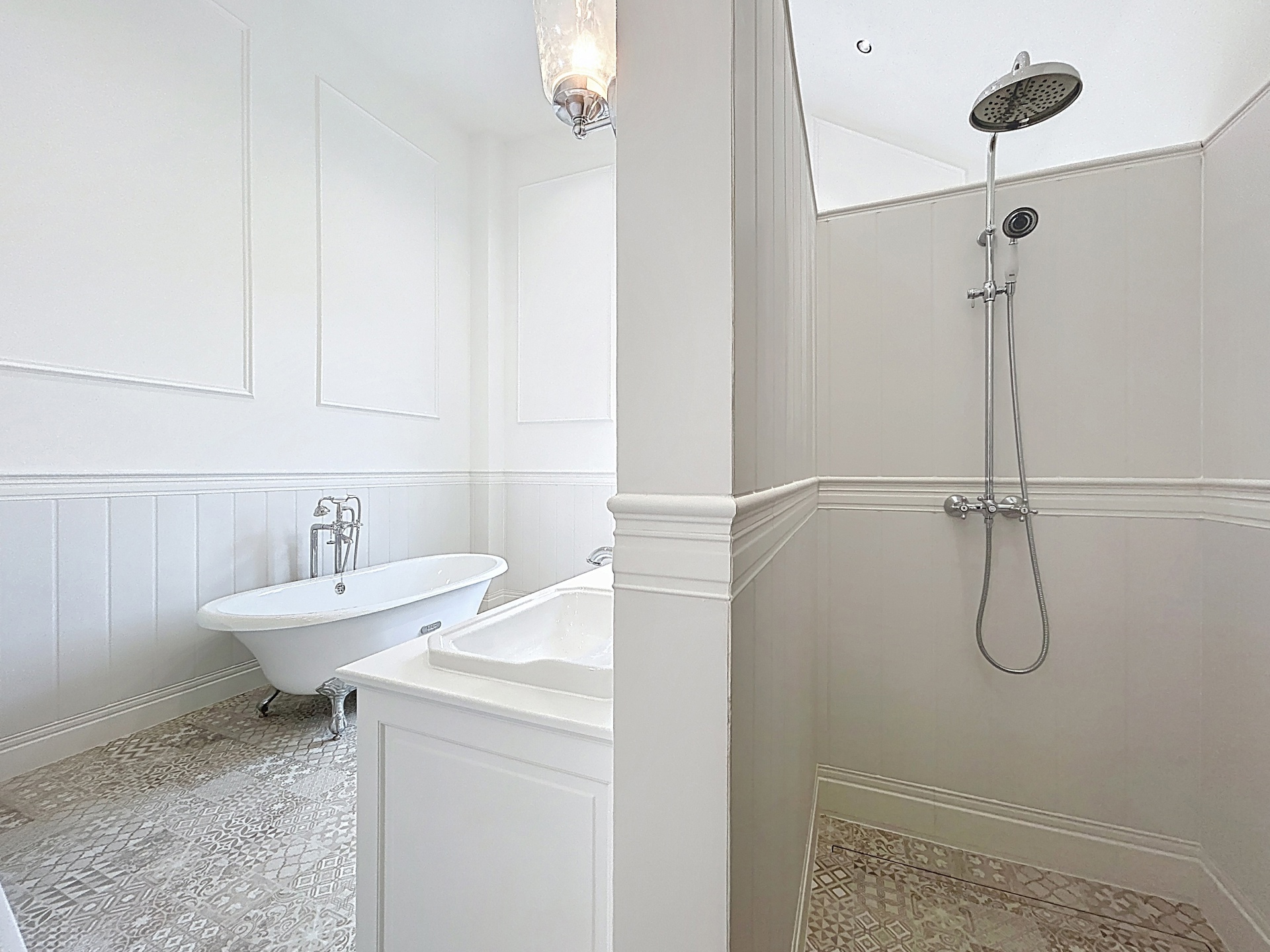 ** Entresol (± 55m²) : palier - chambre 1 (± 22m²) en enfilade avec un espace dressing (± 17m²) - salle de bains (baignoir, douche, double lavabo et w.c.).